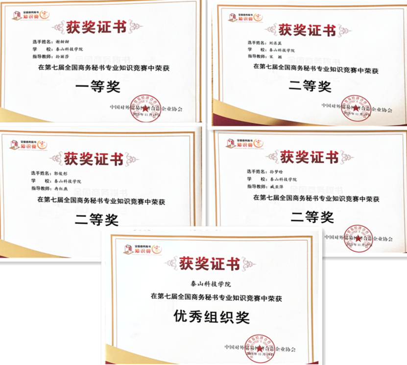 2025年11月,由中国对外贸易经济合作企业协会主办的第七届全国商务秘书专业知识竞赛圆满落幕。泰山科技学院行政管理学院秘书学、现代文秘专业学生在秘书学教研室老师孙丽莎、冉红燕、宋颖、臧亚萍的指导下,凭借扎实的专业功底和出色的临场发挥,取得参赛161人、获奖118人的优异成绩,获奖率高达73%。