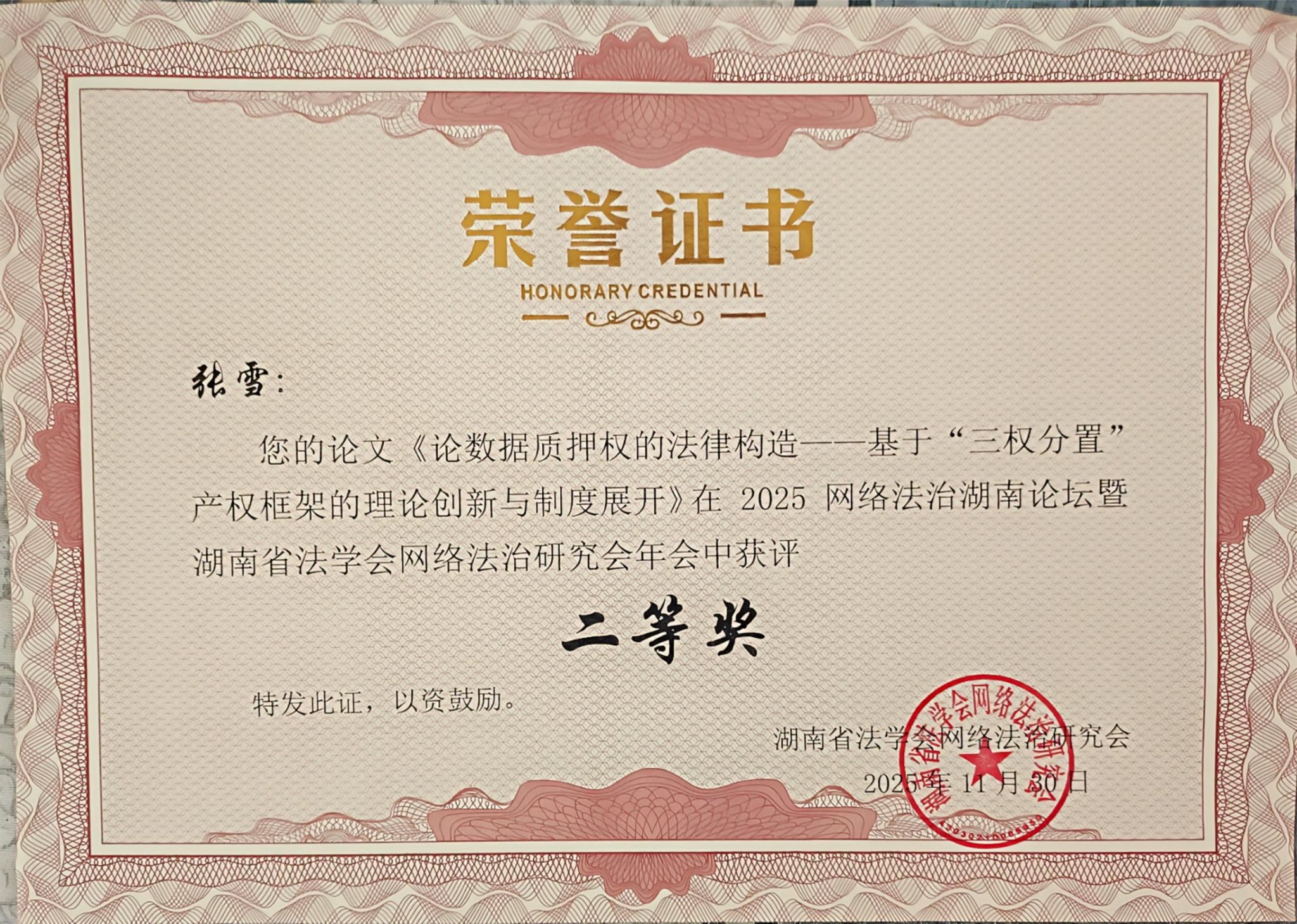 在分论坛二“网络法治理论专题”研讨环节,张雪老师以《论数据质押权的法律构造——基于“三权分置”产权框架的理论创新与制度展开》为题作主题报告。报告立足数字经济高质量发展背景,紧扣我国数据产权制度建设核心需求,从“三权分置”产权框架的理论适配性切入,系统论证数据质押权的主体界定、客体范围与实现路径,获得与会专家的高度评价与广泛认可。凭借该研究成果的学术价值与应用价值,张雪老师在本次年会学术论文评选中斩获二等奖。