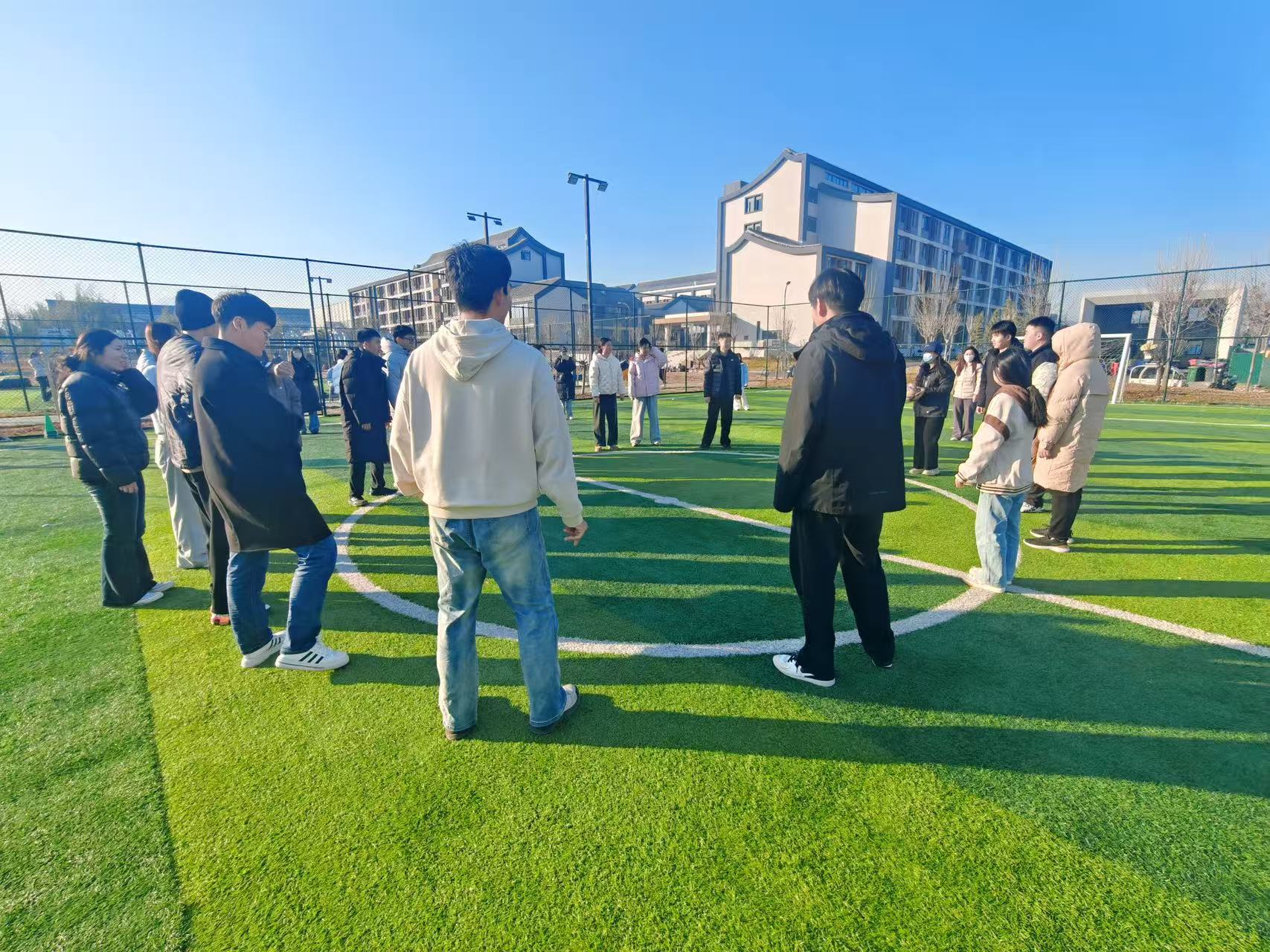 活动尾声,夕阳把草坪染成金色,大家站成圆圈玩起趣味传球游戏。“传给我!”“左边左边!”的喊声此起彼伏,球一传到谁手里,他两侧的同学立刻默契蹲下,唯有持球者稳稳站立,动作衔接间满是欢乐。就算偶尔传错球,大家也笑得前仰后合。原本互不认识的同学开始相互约球,刚组队的队友已经敲定周末训练计划:“下周六老地方见,练射门!”深秋的风再凉,也抵不过这份因足球燃起的热乎劲儿。