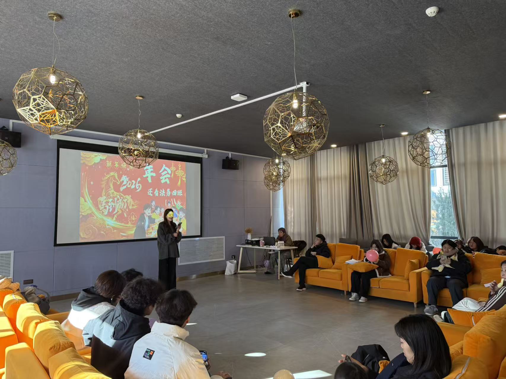 主持人手持话筒站在投影屏前,屏幕上“2026年会 还看法务四班”的喜庆画面格外亮眼。她一字一句认真介绍着年会的每一个环节,从游戏规则到奖品设置,都讲得明明白白。台下的同学们都坐得端端正正,眼睛紧紧盯着主持人,时不时点点头,眼里满是对接下来活动的期待,连坐在橙色沙发上的同学都不自觉地往前凑,生怕错过任何一个细节。