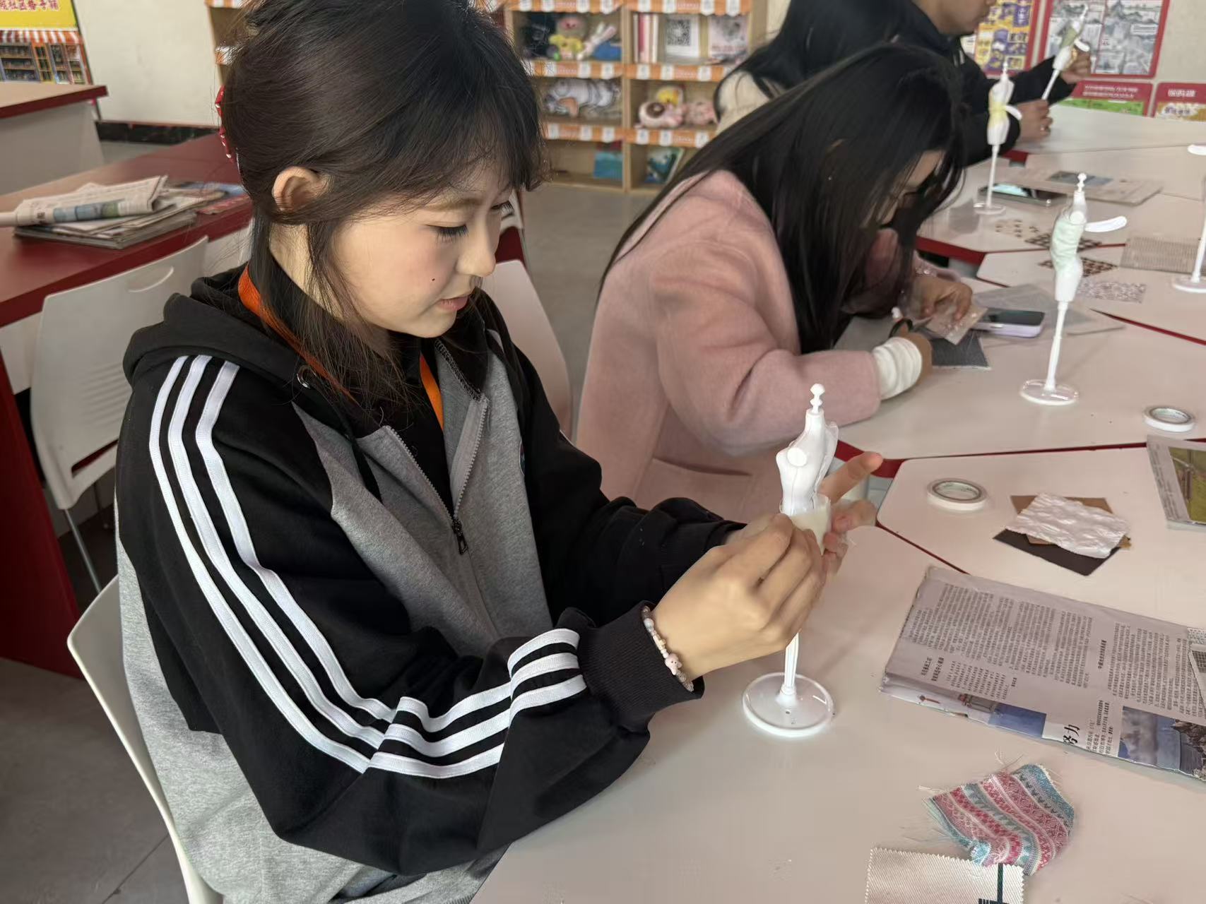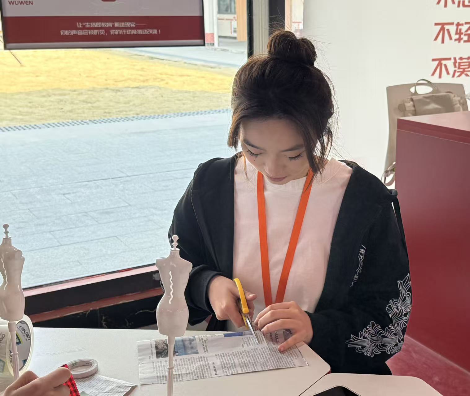 活动现场,同学们两至三人一组,围绕28厘米迷你人台展开创作。碎布、旧报纸、塑料包装袋这些常被忽视的材料,在一双双巧手中化腐朽为神奇。紧扣政务办公、行政统筹、公共服务等真实场景,大家将利落线条、规整版型与实用细节融入设计:带有文字肌理的报纸,化为办公风独有的质感;可塑性极强的塑料,塑造出挺括飒爽的职场轮廓;缤纷的碎布拼接,织就秩序与美感并存的纹样。一件件迷你职业装,既是环保创意的生动呈现,更将行管学子内化于心的专业气质,凝练为可见可感的艺术表达。