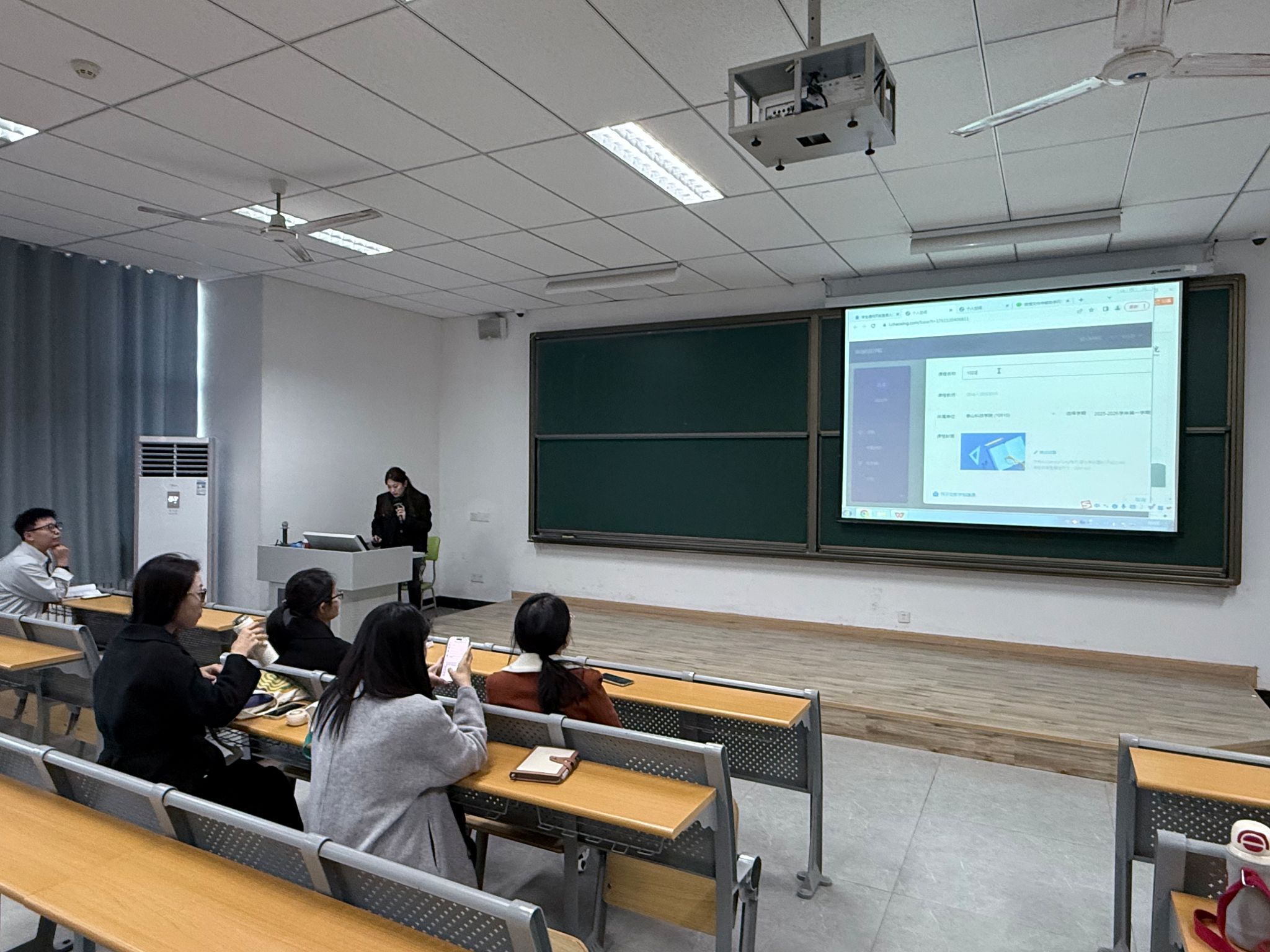 随后,教研室教师徐志萍以“学习通课堂全流程功能实操”为主题进行分享。她结合行政管理专业教学案例,从课前预习任务发布与资源推送、课中签到考勤、实时互动(抢答、弹幕、小组讨论)、随堂测试等功能的灵活运用,到课后作业批改、学情数据统计与分析的实操方法,进行了逐一演示与讲解。针对教师提出的“如何实现作业分层布置”“学情数据如何辅助教学改进”等问题,她现场进行操作演示,并分享了实用的解决方案,有效解决了教师们的实操困惑。