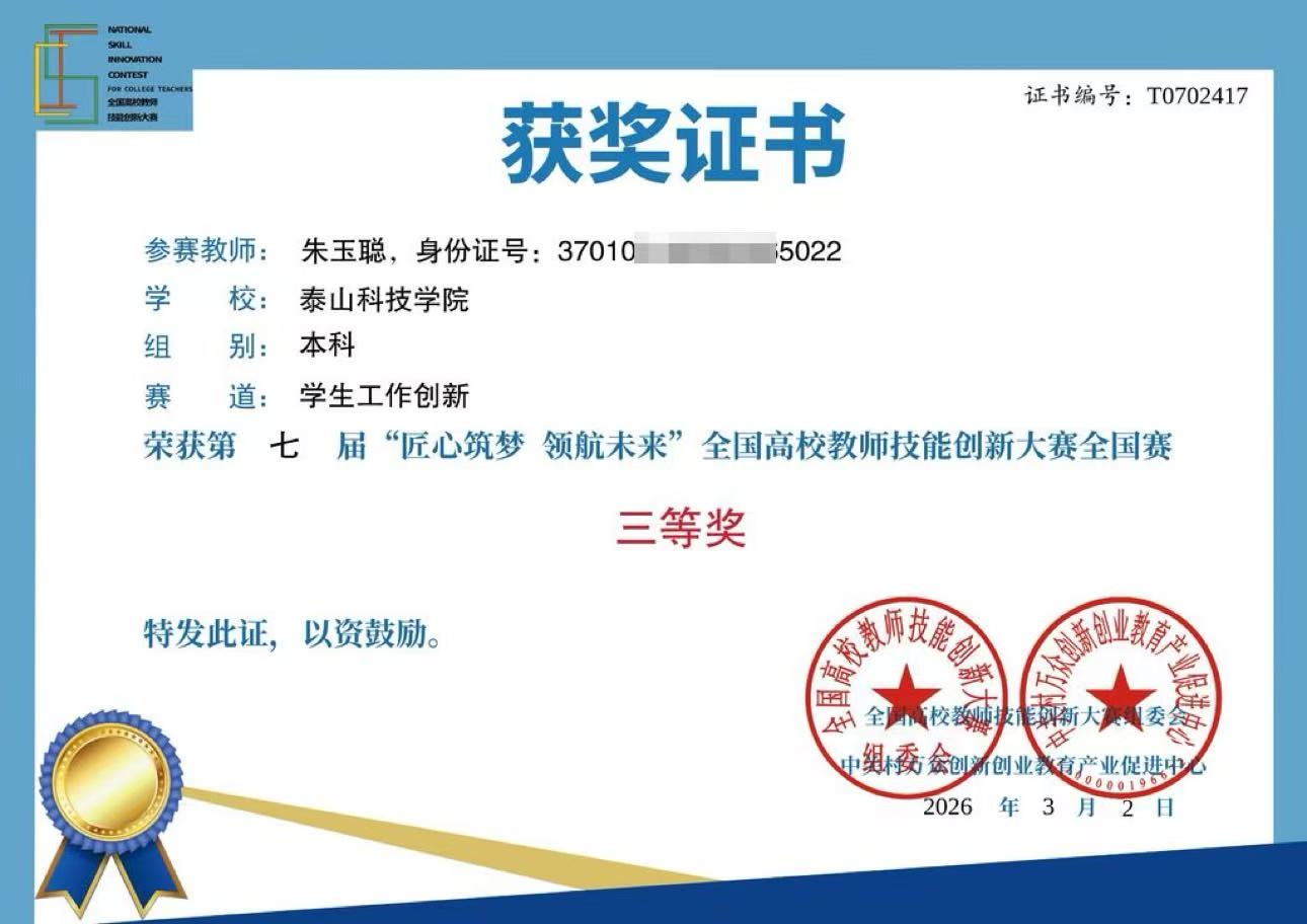 朱玉聪老师始终坚守立德树人根本任务,立足高校学生工作主责主业,严格对标“三全育人体系升级工程”建设要求,秉持严谨务实的工作作风,持续探索适配我校应用型人才培养定位的学生工作创新路径与育人模式。本次大赛中,她在学生工作创新赛道凭借体系化的创新实践成果、可复制可推广的育人思路取得优异成绩,荣获全国三等奖,充分展现了我校学生思想政治教育与日常管理工作的深耕成果,彰显了我校“价值引领+能力塑造”双轮驱动的育人特色。